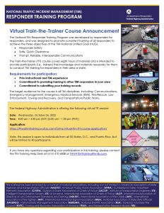 On behalf of the FHWA Traffic Incident Management (TIM) Program, we would like to announce that FHWA will be offering an additional virtual TIM Train-the-Trainer (TtT) session this year. The session is scheduled for Wednesday, October 26, 2022, from 8:00 am to 4:30 pm EDT (5:00 am to 1:30 pm PDT). The attached course announcement provides the session details and a link for applying.